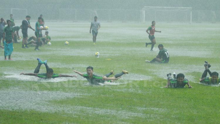 Hujan deras tersebut juga membuat sesi latihan Timnas Indonesia U-16 terganggu. Lalu apa tanggapan dari pelatih Timnas U-16, Fakhri Husaini, perihal hujan deras tersebut?