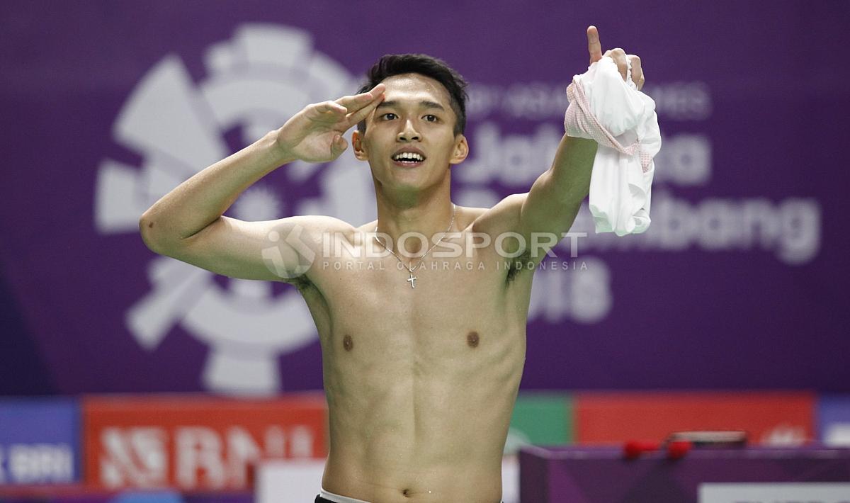 Aksi selebrasi Jonatan Christie usai menang dan memastikan raih medali emas Asian Games 2018.