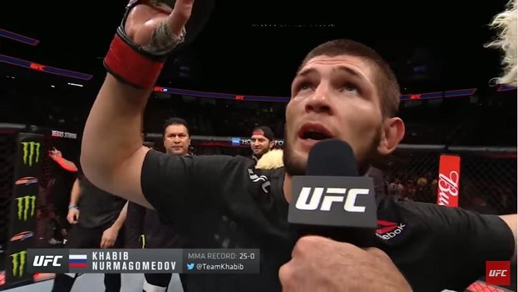 Atlet muslim pertama yang juara UFC itu naik pitam setelah dihina terus-terusan agamanya oleh McGregor. Pada pertandingan tersebut, kemenangan Khabib dilakukan dengan teknik submission, tepatnya lewat teknik rear-naked choke (cekikan leher) yang membuat McGregor menyerah.