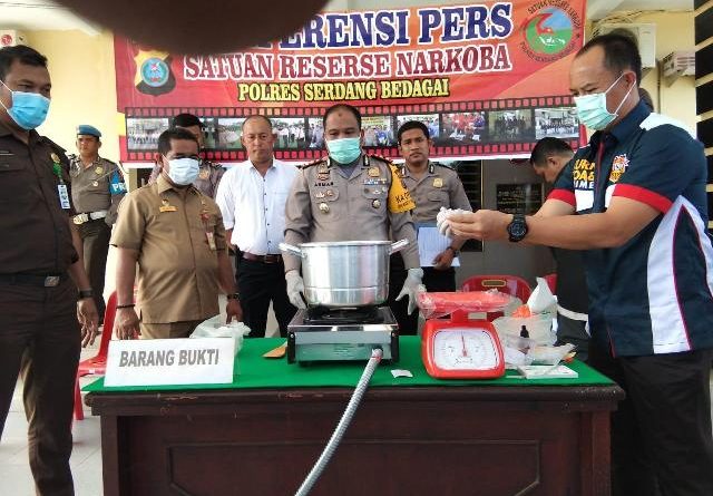 SERGAI(Sumut),Wikimedan | Seberat 893,34 Gram sabu-sabu serta 4 butir pil extasi di musnahkan dengan cara di rebus, pemusnahan itu langsung di pimpin Kapolres Sergai AKBP. Juliarman Eka Putra Pasaribu S. Sos. SIK. MSI disaksikan Kasubdit Labfor Cabang Medan AKBP.Zulni Erna, Asisten I Kab Sergai Herlan Pangabean, Perwakilan BNNK Sergai Kompol A Pasaribu, Kasat Narkoba Polres Sergai AKP. Martualesi Sitepu, JPU Kejaksaan Sergai serta dua tersangka kepemilikan 1 Kg Sabu Senin (3/12) dihalaman teras Mapolres Sergai.