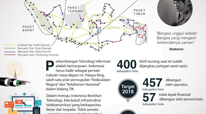 Jakarta, Wikimedan – Proyek Palapa Ring masih dalam tahap pengerjaan dan diharapkan akan rampung di tahun 2019 mendatang. Palapa Ring sendiri merupakan proyek pembangunan jaringan serat optik nasional yang akan menjangkau sebanyak 34 provinsi, 440 kota atau kabupaten di seluruh Indonesia dengan total panjang kabel laut mencapai 35.280 kilometer serta kabel di daratan mencapai 21.807 kilometer.