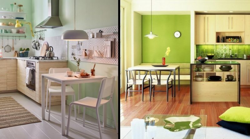 4. Letakkan meja makan kecil yang bergabung dengan kabinet dapur sebagai penyekat. Pilih warna hijau pada dindingnya untuk memberikan kesan segar pada ruangan