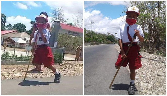 Yessi Ndun semangat pergi ke sekolah dengan tongkat sebagai penyangga kakinya [sumber gambar]Fisik yang tak sempurna bukan menjadi penghalang bagi Stenly Yesi Ndun untuk tetap bersekolah. Bocah difabel asal Desa Tuapanaf, Kecamatan Takari, Kabupaten Kupang, Nusa Tenggara (NTT) itu hanya memiliki satu kaki sejak dilahirkan. Meski demikian, ia tetap semangat pergi menimba ilmu dengan menggunakan tongkat kayu sebagai penyangga. Benda itulah yang menemaninya dalam perjalanan sejauh 1 kilometer.