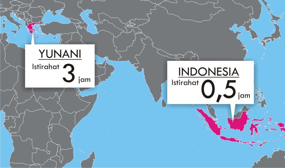Nah kalau di Indonesia sendiri, waktu istirahat sendiri sebenarnya sudah diatur dalam Undang-Undang Ketenagakerjaan lo. Kita diperbolehkan kerja selama 40 jam dalam 1 minggu. Nah kalau soal istirahatnya, kita boleh istirahat minimal 30 menit setelah bekerja selama empat jam terus menerus dan hal itu nggak dihitung sebagai jam kerja. Tapi dengan berbagai pertimbangan tersendiri dan menyesuaikan kebiasaan tiap negara, ternyata pemberlakuan jam istirahat siang tiap negara berbeda-beda lho. Dikutip dari Reader’s Digest, bahkan ada yang memberi waktu istirahat hingga 3 jam lamanya. Enak banget ya~ Kulik yuk negara mana saja yang memberi waktu istirahat paling lama bersama Wikimedan News & Feature~