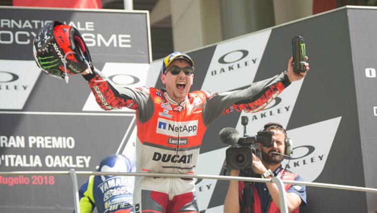 Pembalap Ducati, Jorge Lorenzo, selebrasi usai memenangi MotoGP Italia 2018.