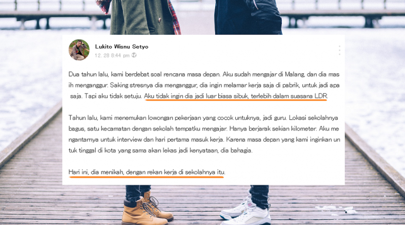 Long distance relationship…Mendengar kalimatnya saja sudah ngeri-ngeri sedap. Apalagi menjalaninya. Yap! boleh dibilang LDR jadi salah satu jenis hubungan yang dihindari banyak orang. Karena biasanya menjalani LDR butuh kesabaran dan pengertian yang ekstra dibanding hubungan biasa.Nah baru-baru ini ada seorang netizen bernama Lukito Wisnu Setyo membagikan kisah sedih sekaligus haru lewat status Line. Awalnya Lukito menjalin hubungan LDR. Kemudian untuk membangun kedekatan yang lebih intens ia mencarikan pacarnya pekerjaan di kota di mana ia bekerja. Alih-alih semakin mudah karena jarak semakin dekat saat pacarnya sudah memiliki pekerjaan, tapi nasib malah berkata sebaliknya.Akhirnya, dia menikah dengan yang lainnya~ via timeline.line.meMiris memang menyimak kisah juga viral di Twitter ini. Sebab usaha baik Lukito mencarikan pekerjaan baru itu justu memperkenalkan pacarnya dengan jodohnya. Dari sini kita bisa belajar banyak hal, terlebih soal bagaimana seharusnya bersikap soal LDR-an. Seperti yang Wikimedan uraikan di bawah ini. Yuk sama-sama pahami~1. LDR butuh mental dan kesabaran yang kuat. Kesibukan pasangan selalu jadi sesuatu yang wajib dimengertiButuh kesiapan via www.pexels.comKisah Lukito Wisnu ini jadi bukti bahwa menjalani LDR butuh kesiapan mental yang matang. Tersiksa karena rindu jadi hal yang pasti. Belum lagi saat dia sedang sibuk dengan pekerjaannya, kamu bakal gemas karena serba salah, mau marah tapi nggak bisa karena sudah konsekuensi kerjaannya. Maka dari itu, yang dibutuhkan nggak hanya kesabaran, melainkan juga pengertian yang luar biasa besarnya.Kalau nggak siap, ya, mending jangan.2. Apa yang dialami Lukito sekaligus membuktikan bahwa nggak semua LDR berjalan dengan lancar :’)Jangan takut pada jarak via www.unsplash.comMeski LDR itu berat, tapi nggak perlu berlebihan menyikapi sebuah jarak. Sebab kisah sedih Lukito ini juga membuktikan bahwa jarak bukanlah penyebab kandasnya hubungan. Lika-liku LDR yang dijalani Lukito harus kandas justru pada saat dia nggak LDR. Banyak hal yang mesti diperhatikan dalam menjalin hubungan. Namun yang paling utama itu komunikasi. Sebab biasanya yang berdekatan justru meremehkan.3. Dalam cinta, banyak hal yang nggak berjalan sesuai rencana. Inilah pentingnya untuk nggak terlalu berharap tinggi dari sanaBerharap secukupnya via maddiecmarketing.blogspot.comSama laiknya hidup, banyak hal dalam hubungan yang seringkali nggak sesuai rencana. Bedanya dalam hubungan biasanya orang terlalu menaruh harap sampai lupa untuk beraikab realistis. Inilah yang seringkali melukai hati. Harapan yang terlalu tinggi berujung sakit hati. Maka dalam cinta, penting untuk mengontrol diri. Bijaklah dalam bersikap dan menaruh harap. Cintai orang sewajarnya saja agar saat menerima kenyataan pahit, kamu masih bisa tahan. Inilah yang dilakukan Lukito, meski sakit ia masih bisa menerima kekasihnya nikah bersama orang lain.4. Dalam cinta, kadang kala kita hanya perlu berpasrah kepada semesta. Sebab kadang ketakutan yang berlebihan justru membawa petakaPasrah via www.unsplash.comCinta yang teramat mendalam kadang membuat orang terlalu berambisi. Banyak kasus hubungan yang gagal karena memaksakan kehendak sendiri dalam hubungan. Contohnya saat LDR, seringkali orang ingin pacarnya berada dalam kota yang sama sampai ia mengusahakan segala cara. Ini memang niat yang baik, tapi nggak semua niat baik itu disetujui oleh semesta.Boleh jadi LDR itu jadi ujian sebelum melanggeng ke pelaminan. Kadang kita hanya perlu bersabar, berpasrah dan menyerahkan semuanya kepada Tuhan. Biarkan semesta yang menuntunkan jalannya.5. Kadang cinta memang nggak bisa kita miliki. Tapi melihatnya bahagia saja nampaknya sudah cukup membuat kita ikhlas menerima semuanyaCinta nggak harus memiliki via metro.co.ukMemang sebaik-baiknya cinta saat kita bisa memiliki orang yang kita cintai. Namun jangan lupa cinta ini nggak selamanya sederhana, kadang ada seseorang yang hanya ditakdirkan kepada kita hanya untuk sesaat saja. Kita dipertemukan dengannya hanya untuk saling belajar mengikhlaskan, bukan memiliki.Inilah yang dirasakan Lukito Wisnu. Ketika takdir berkata lain, maka mau nggak mau ia mesti merelakan kekasihnya berjodoh dengan orang lain. Kadang memang perjuangan kita hanya sebagai persinggahan sebelum dia dengan orang lain. Saat dia sudah bahagia dengan yang lain, ya sudah ikhlaskan saja. Mungkin memang bukan jodohnya.Semoga apa yang dialami cowok satu ini bisa menjadi inspirasi kita bersama. Pun kamu yang saat ini tengah jalani LDR-an. Tak perlu cemas, tapi juga tak perlu berharap berlebihan. Nikmati saja perjalanan hubunganmu. Toh pahit manis di dalamnya, akan buatmu belajar soal cinta 🙂Artikel Bermanfaat dan Menghibur Lainnya