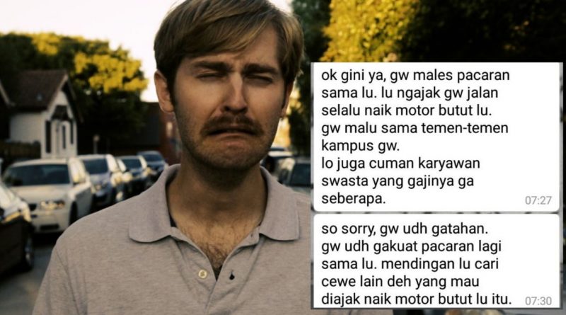 Sebuah chat yang diunggah melalui akun @rlthingy2 memperlihatkan warganet yang sedang sakit hati pasca diputus pacar. Seraya membubuhi kutipan kalau harga dirinya sebagai cowok hilang, dia juga memperlihatkan bagaimana alasan si mantan mengakhiri hubungan mereka. Bukannya baik-baik, mantan justru memberikan alasan yang bikin sakit hati sekaligus minder. Mulai dari karena si cewek sudah menemukan orang lain yang lebih romantis, hingga karena si cewek malu diboncengi motor butut dan berpacaran dengan karyawan swasta yang gajinya nggak seberapa. Potongan percakapan ini otomatis bikin warganet lain yang membaca ikut geram dan sebel.