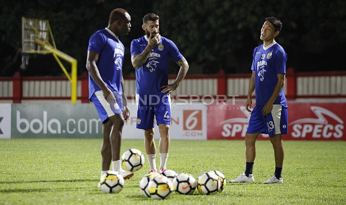 Ki-ka: Victor Igbonefo, Bojan Malisic, dan Oh In Kyun berbincang sebelum memulai latihan.