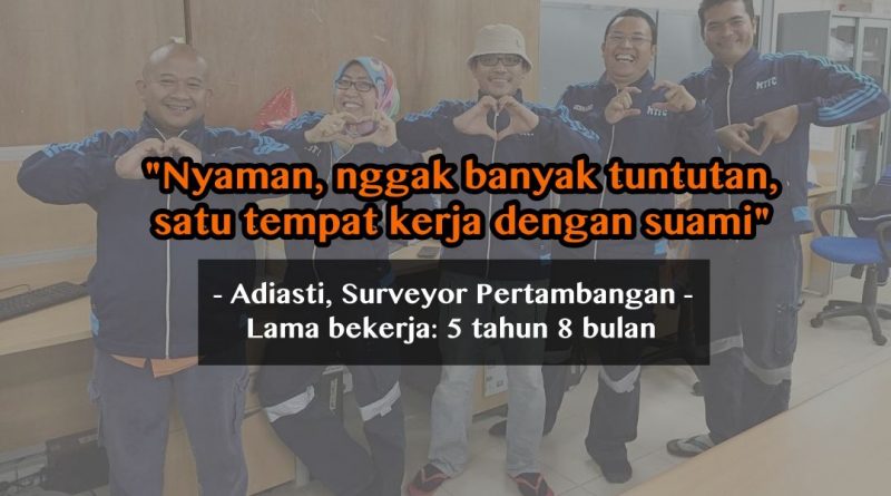 Bekerja selama 5 tahun 8 bulan di perusahaan pertambangan sebagai salah satu surveyor tentu bukan hal yang mudah. Namun siapa sangka jika alasan tetap bertahan di perusahaan pertambangan bukan hanya karena benefit-nya yang lumayan, tapi juga karena nggak terlalu banyak tuntutan dalam pekerjaan, mungkin karena risikonya sendiri yang sudah cukup tinggi. Satu lagi, rupanya bisa satu tempat kerja dengan pasangan jadi alasan tersendiri yang bikin ‘betah’. Hihihi~