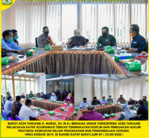 ACEH TAMIANG Wikimedan | Dalam rangka mempertegas Peraturan Bupati Nomor 30 Tahun 2020, dengan ini Gugus Tugas Percepatan Penanganan Covid-19 Kabupaten Aceh Tamiang mengadakan Rapat Koordinasi Penegakan Hukum Peraturan Bupati Nomor 30 Tahun 2020 yang bertempat di Ruang Rapat Bupati Aceh Tamiang sekira pukul 15.00 wib, Jum’at (25/09/2020).Dalam hal ini Rapat dipimpin langsung oleh Bupati Aceh Tamiang H. Mursil, SH, M.Kn, pertama sekali beliau mengucapkan terima kasih kepada semua tamu yang telah memenuhi undangan ini.