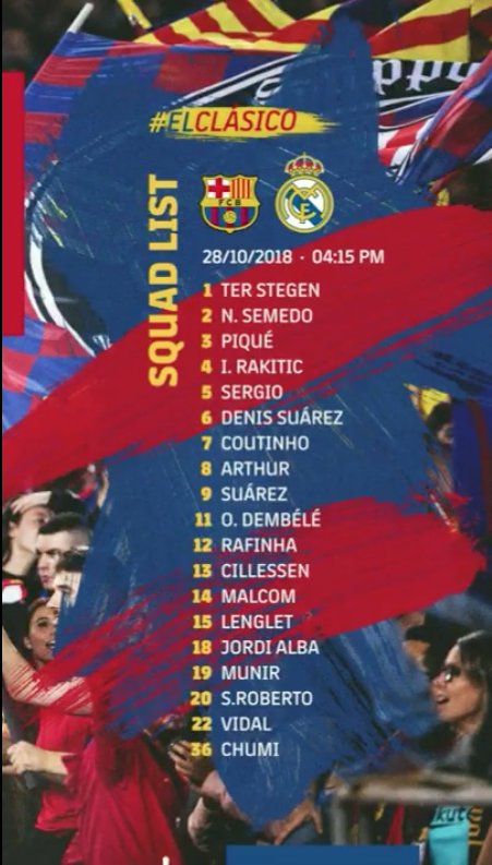 Messi tentunya dipastikan absen ketika Real Madrid berkunjung ke Camp Nou pada hari Minggu (28/10) ini, oleh karena itu trio yang terdiri dari Luis Suarez, Rafinha dan Philippe Coutinho kembali difavoritkan untuk dimainkan sejak awal oleh Valverde, namun ia tidak menutup kemungkinan untuk memainkan Dembele setelah memanggilnya dalam skuat yang dipanggil, terlepas dari perilakunya yang tidak disiplin belakangan karena datang telat pada laga kontra Inter.