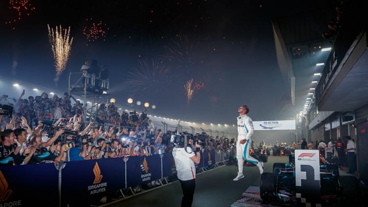 Lewis Hamilton selebrasi usai juara F1 GP Singapore 2018.