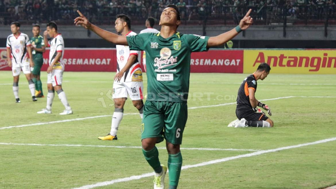 Selebrasi Misbakus Solikin setelah bobol gawang Mitra Kukar.