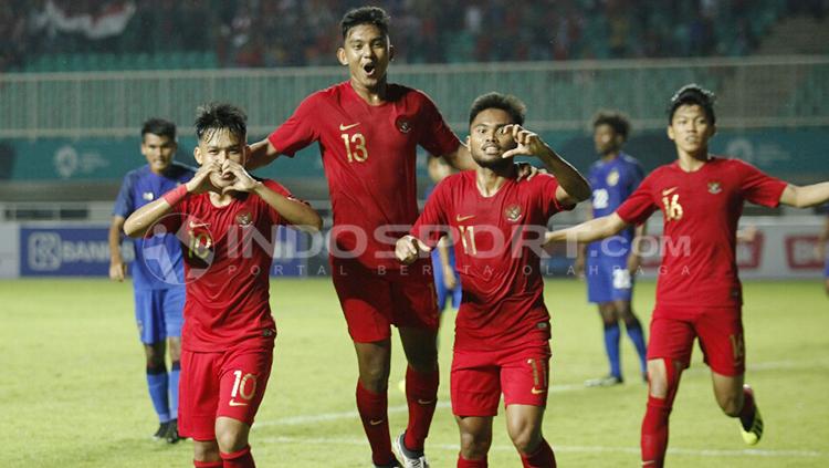 Penggawa Timnas U-19 Indonesia melakukan selebrasi.