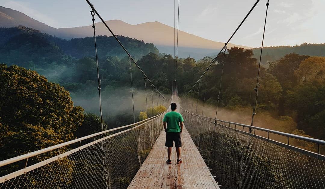 Lanskap taman nasional yang hijau seolah menambah keindahan jembatan ini. Instagramable banget sih jembatan ini!