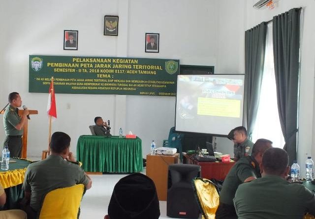 ACEH TAMIANG Wikimedan | Pelaksanaan Kegiatan Pembinaan Peta Jaring Teritorial Semester-II TA. 2018 Kodim 0117/Atam dengan tema ,”TNI-AD Melalui Pembinaan Peta Jarak Jaring Teritorial Siap Menjaga Dan Mewujudkan Stabilitas Keamanan Serta Ketahanan Wilayah Guna Mempererat Ke-Bhinneka Tunggal Ika-an Agar Tetap Terjaga Kedaulatan Negara Kesatuan Republik Indonesia,” yang di pimpin Mayor Inf A. Ayani bertempat di Aula Makodim 0117/Atam alamat Desa Sungai Liput Kec. Kejuruan Muda Kab. Aceh Tamiang, Rabu (5/12/2018)