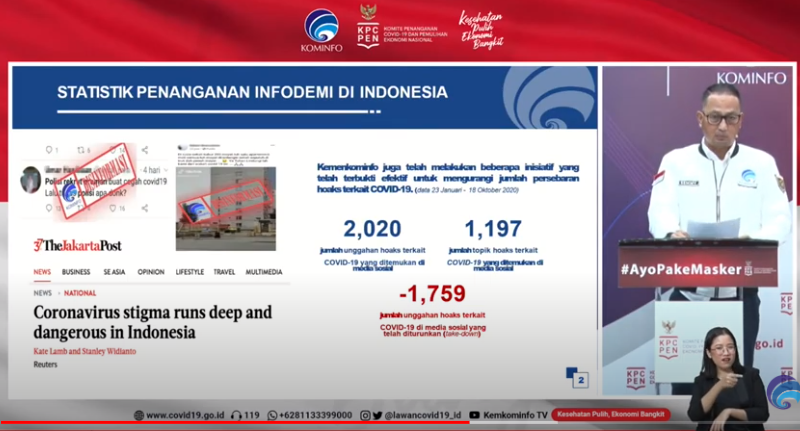“Saat ini menurut data Kominfo per-23 Januari–18 Oktober 2020, jumlah unggahan hoaks seputar Covid-19 didapati sebanyak 2020 yang tersebar di sosial media. Lalu dari sebaran itu ada sebanyak 1,197 topik hoaks terkait Covid-19, dan kami telah men-take down sebanyak 1,759 unggahan tersebut,” ujarnya.