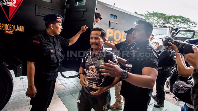Djajang Nurdjaman turun dari kendaraan rantis.