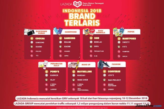 Lazada Group mencatatkan perolehan 1,3 milyar visitor sepanjang perhelatan 11.11 sampai 12.12. Sementara untuk Lazada Indonesia sendiri, pergelaran akbar 12.12 Grand Year End Sale yang berlangsung tiga hari, 10 – 12 Desember 2018, ini mencatat kenaikan GMV sebesar 18 kali dari hari biasanya.
