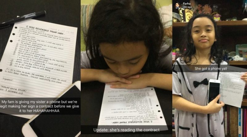 Dilansir dari laman worldofbuzz, seorang pengguna Twitter bernama Farha menceritakan bahwa sang adik yang bernama Yasmine meminta iPhone baru kepada orang tua mereka. Gadis yang masih berusia 10 tahun itu meminta HP-nya diganti. Sebenarnya orang tua Yasmine nggak mempermasalahkan permintaan anaknya. Tapi mereka nggak mau memberi secara “cuma-cuma”. Oleh karena itu, untuk mendapatkan HP baru yang diinginkan, Yasmine harus menyetujui surat perjanjian atau kontrak yang dibikin oleh orang tua dan kakaknya.