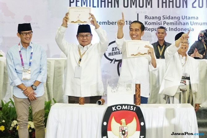 “Dengan ini memutuskan, menetapkan, pasangan calon nomor urut Pilpres 2019. Pasangan Jokowi-Ma’ruf Amin nomor 1 dan Prabowo-Sandi nomor 2,” ujar Ketua KPU Arief Budiman.