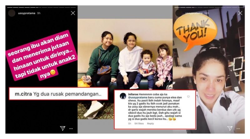 Ibu mana pun kalau mendapatkan komentar seperti di atas sudah pasti terluka, sakit hati. Saking kesalnya bisa menangis sejadinya seperti Ussy. Dari Instastory-nya, terlihat wajah Ussy yang sembab, matanya yang bengkak, dan hidungnya yang merah karena menangis. Ussy berterima kasih kepada orang-orang yang sudah mendukungnya dan menguatkannya di tengah jahatnya komentar-komentar warganet ini.