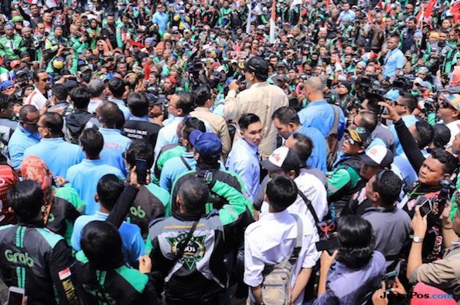 Mendengar pernyataan Prabowo, ribuan pengemudi ojol pun langsung menyambut permintaan tersebut. Mereka berteriak lantang akan tetap mendukung Prabowo. Sekalipun mantan menantu Soeharto itu tak meminta dukungan ke para pengemudi ojol.