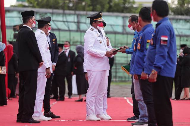 MEDAN Wikimedan | Pimpin Upacara Penurunan Bendera, Wali Kota Medan Sematkan Tanda Kehormatan Satyalancana Karya Satya kepada ASN. Wali Kota Medan Bobby Nasution memimpin upacara penurunan bendera merah putih dalam rangka memperingati Hari Kemerdekaan Republik Indonesia ke -76 tahun 2021 di lapangan Stadion Teladan, Selasa (17/8). Sebelum penurunan bendera Bobby Nasution menyerahkan penghargaan tanda kehormatan Satyalancana Karya Satya dari Presiden RI kepada Aparatur Sipil Negara (ASN) di lingkungan Pemko Medan.
