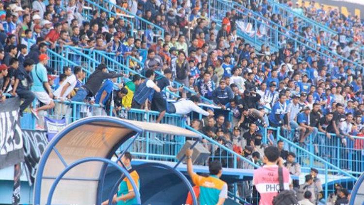 Suporter Arema FC yang melakukan penimpukan terhadap para pemain Persebaya.