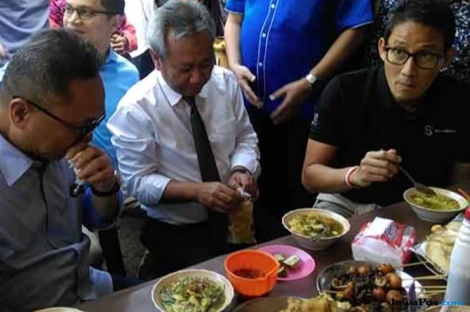 “Saya baru pertama kali ini mencoba bersama Bang Zul (Zulkifli Hasan), dan rasanya maknyus sekali,” ungkap Sandi usai menghabiskan soto seharga Rp 5.000 tersebut.
