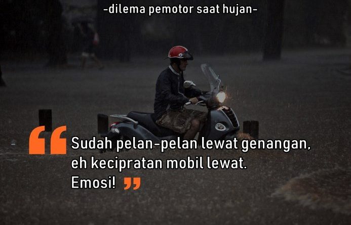 Meski yang kamu punya hanyalah kendaraan roda dua, bersyukurlah. Setidaknya kamu bisa melakukan manuver di sebuah kemacetan, ketimbang menunggu antrean kendaraan yang nggak usai-usai. Bersyukurlah karena kamu masih jauh lebih beruntung dari mereka yang pergi jalan kaki, nggak membawa payung, dan nggak bisa melanjutkan perjalanan. Jadilah pengendara motor yang taat rambu dan punya mental baja!