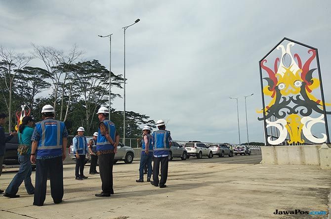 Kemudian, pemandangan dari di sepanjang jalan tol masih berupa rawa dan hutan-hutan. Selanjutnya lambang kebanggaan suku dayak juga terpampang di tengah-tengah jembatan penghubung Tol Balikpapan-Samarinda.