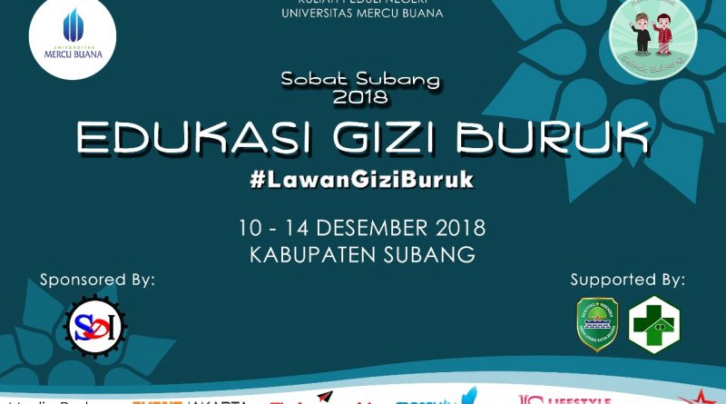 Sobat Subang 2018 Universitas Mercu Buana Fakultas Ilmu Komunikasi bidang Study Public Relations ingin membantu mengurangi angka gizi buruk yang terjadi pada wilayah Subang, Jawa Barat. Dengan mengadakan kegiatan kuliah peduli negeri “Edukasi Gizi Buruk” yang akan dilaksanakan pada tanggal 10 sampai 14 Desember 2018 di Kelurahan Soklat, Kec. Subang, Kab. Subang, Prov. Jawa Barat.