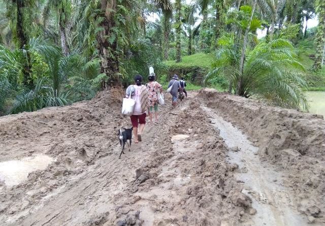 Baru berjalan beberapa saat pemandangan luar biasa pun terlihat didepan mata.Jalan berlubang, sempit, berlumpur,dan berliku-liku.Disamping itu jalannya juga banyak tanjakan curam yang bisa membahayakan pengendara sepeda motor.”Jalan ini hanya bisa dilalui sepeda motor terlebih para pekerja yang memanen hasil petani sawit”ujar Bungaran ditengah perjalanan.