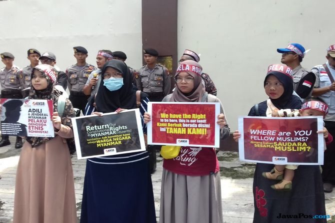 Puluhan massa yang kompak mengenakan ikat kepala dan memegang spanduk bertuliskan ‘Bela Rohingya’ itu, menuntut Pemerintah Myanmar membuka seluas-luasnya akses kemanusiaan di daerah konflik tersebut.