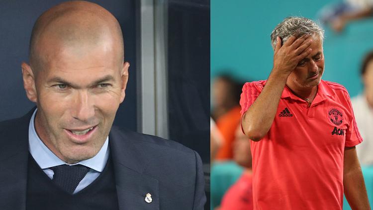 Mantan pelatih Real Madrid, Zinedine Zidane (kiri) dan Jose Mourinho, pelatih Man United.